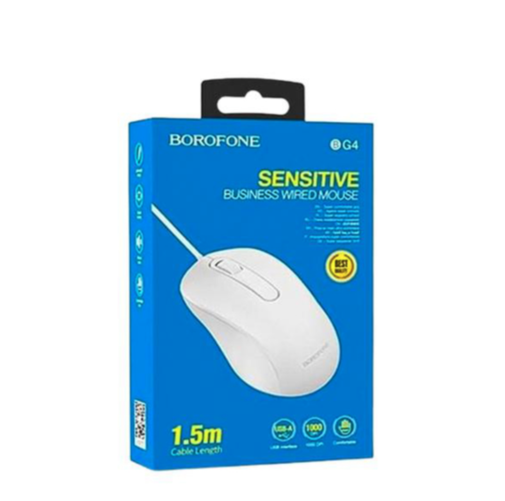 شیوه اتصال Borofone BG4 از نوع با سیم بوده و با استفاده از فیش ورودی USB به سیستم وصل میشود. طول کابل آن 150 سانتیمتر میباشد. این محصول مناسب برای اکثر سیستمعاملها مناسب است. با استفاده از پورت USB، این موس به بقیه اجزاء سیستم وصل میشود. محدوده دقت آن 1000 DPI بوده و با اکثر سیستمعاملهای ویندوز سازگار است. این محصول دارای سه عدد کلید بوده و قابلیت کار کردن با هر دو دست را با آن خواهید داشت. برای خرید این محصول باکیفیت و با قیمت مناسب، درنگ نکنید. این موس خوشدست و زیبا در دو رنگ سفید و مشکی در بازار موجود است.